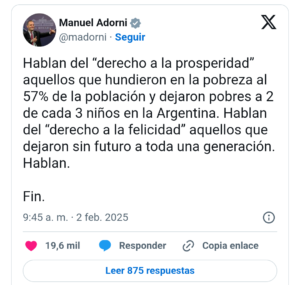 Adorni responsabilizó a Cristina Kirchner por los números de la pobreza en el país, asegurando que durante su gobierno, el 57% de la población cayó en la pobreza y que 2 de cada 3 niños argentinos viven en la pobreza. También la acusó de dejar sin futuro a toda una generación.