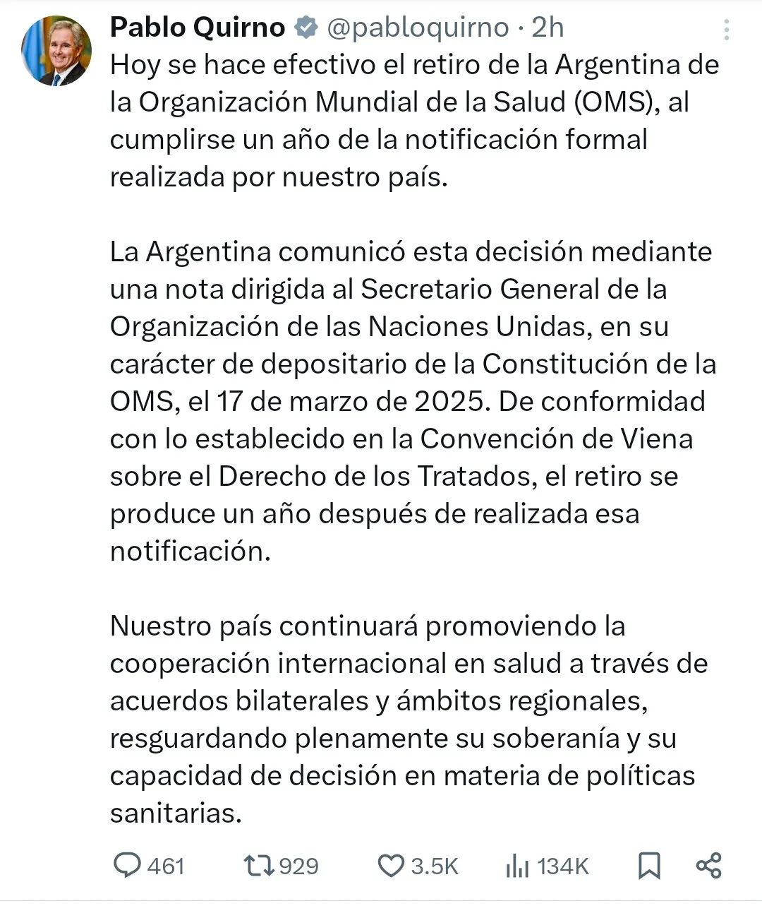 La confirmación llegó por parte del canciller Pablo Quirno, quien explicó que el proceso administrativo se completó luego de que Argentina notificara formalmente su decisión ante la Organización de las Naciones Unidas, entidad que actúa como depositaria de la constitución del organismo sanitario internacional.