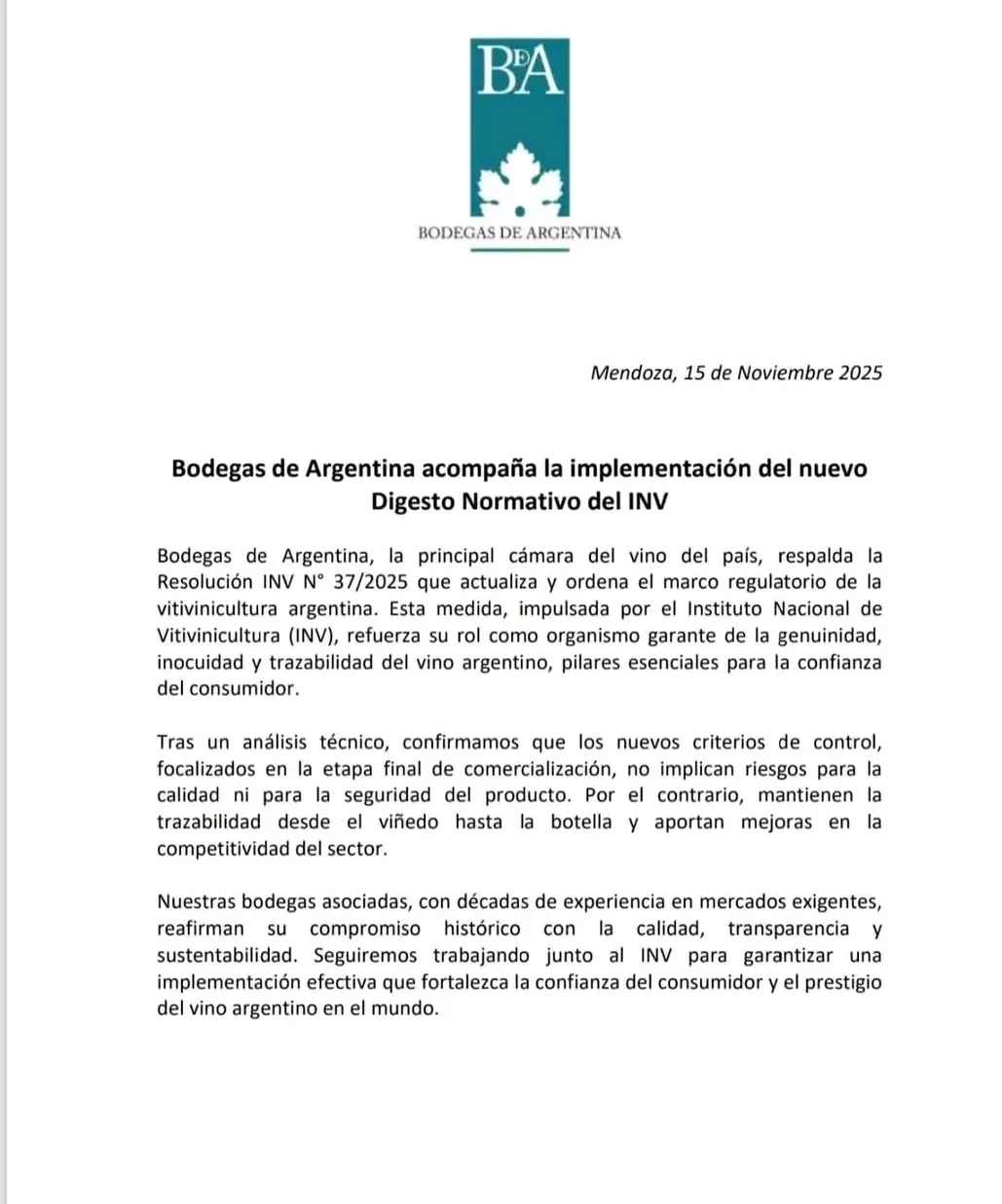 Bodegas de Argentina, la cámara que representa a la mayor parte de la industria vitivinícola del país, expresó su acompañamiento a la Resolución INV N.º 37/2025, que actualiza y ordena el marco regulatorio de la actividad. La medida, impulsada por el Instituto Nacional de Vitivinicultura, busca reforzar su rol como organismo garante de la genuinidad, inocuidad y trazabilidad del vino argentino, elementos centrales para sostener la confianza del consumidor.