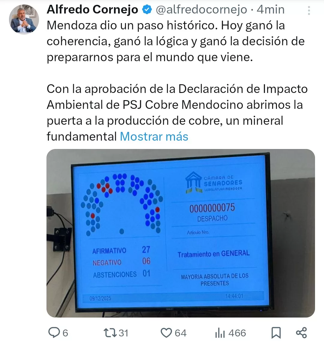 El gobernador Alfredo Cornejo afirmó este martes que la provincia “dio un paso histórico” luego de la aprobación legislativa de la Declaración de Impacto Ambiental (DIA) del proyecto PSJ Cobre Mendocino, una iniciativa que habilita la producción de cobre en Mendoza bajo la vigencia de la Ley 7722.