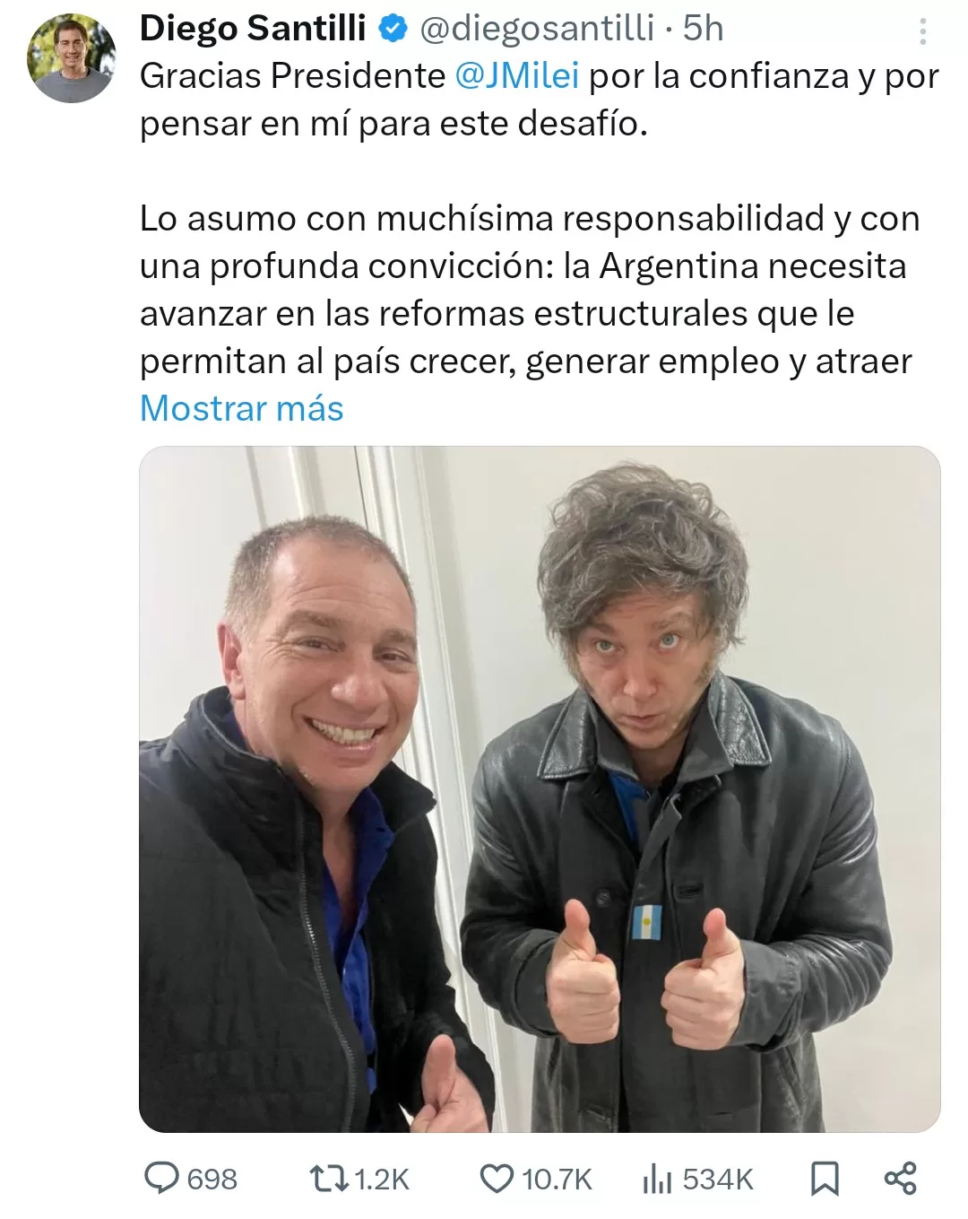 Por su parte, Santilli publicó un mensaje en X (Twitter) para agradecer la confianza del Presidente: