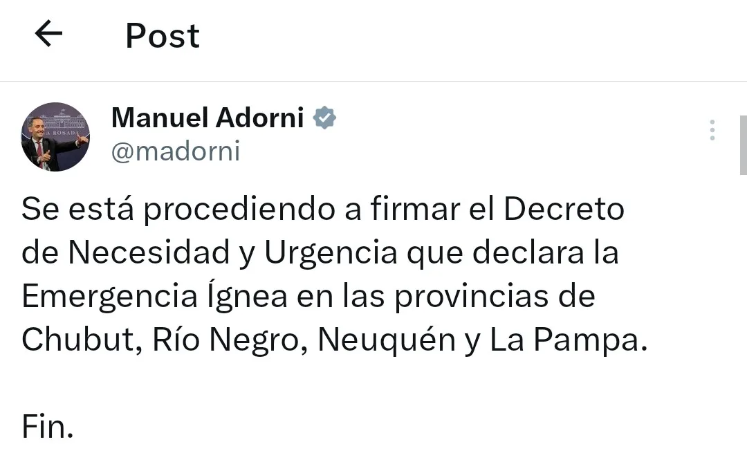 “Se está procediendo a firmar el Decreto de Necesidad y Urgencia que declara la Emergencia Ígnea en las provincias de Chubut, Río Negro, Neuquén y La Pampa”, escribió Adorni en la red social X.