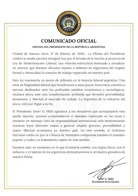 Tras la votación favorable en el Senado, el presidente Javier Milei difundió un comunicado oficial desde la Casa Rosada en el que destacó la media sanción de la reforma laboral y llamó a la Cámara de Diputados a avanzar con el tratamiento “sin dilaciones”.