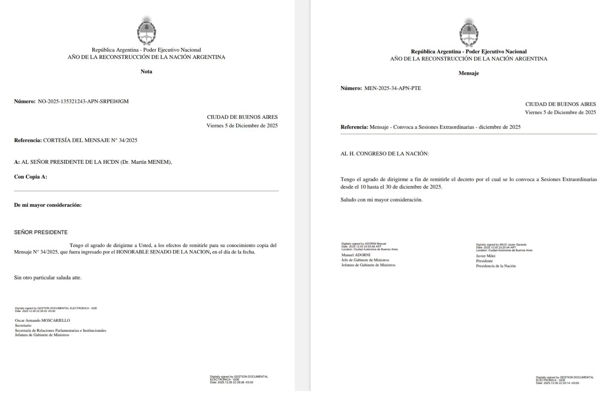 El Poder Ejecutivo oficializó este martes la convocatoria a sesiones extraordinarias en el Congreso de la Nación, que se desarrollarán del 10 al 30 de diciembre, confirmando una hoja de ruta legislativa que anticipa semanas de fuerte actividad política.
