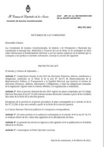 La izquierda presentó un dictamen de minoría y la aprobación del proyecto requerirá de una mayoría absoluta de 129 votos en la sesión del próximo jueves. El proyecto original del Poder Ejecutivo proponía la derogación de las primarias, pero ante la falta de apoyo, los libertarios aceptaron una suspensión de las primarias para este año .