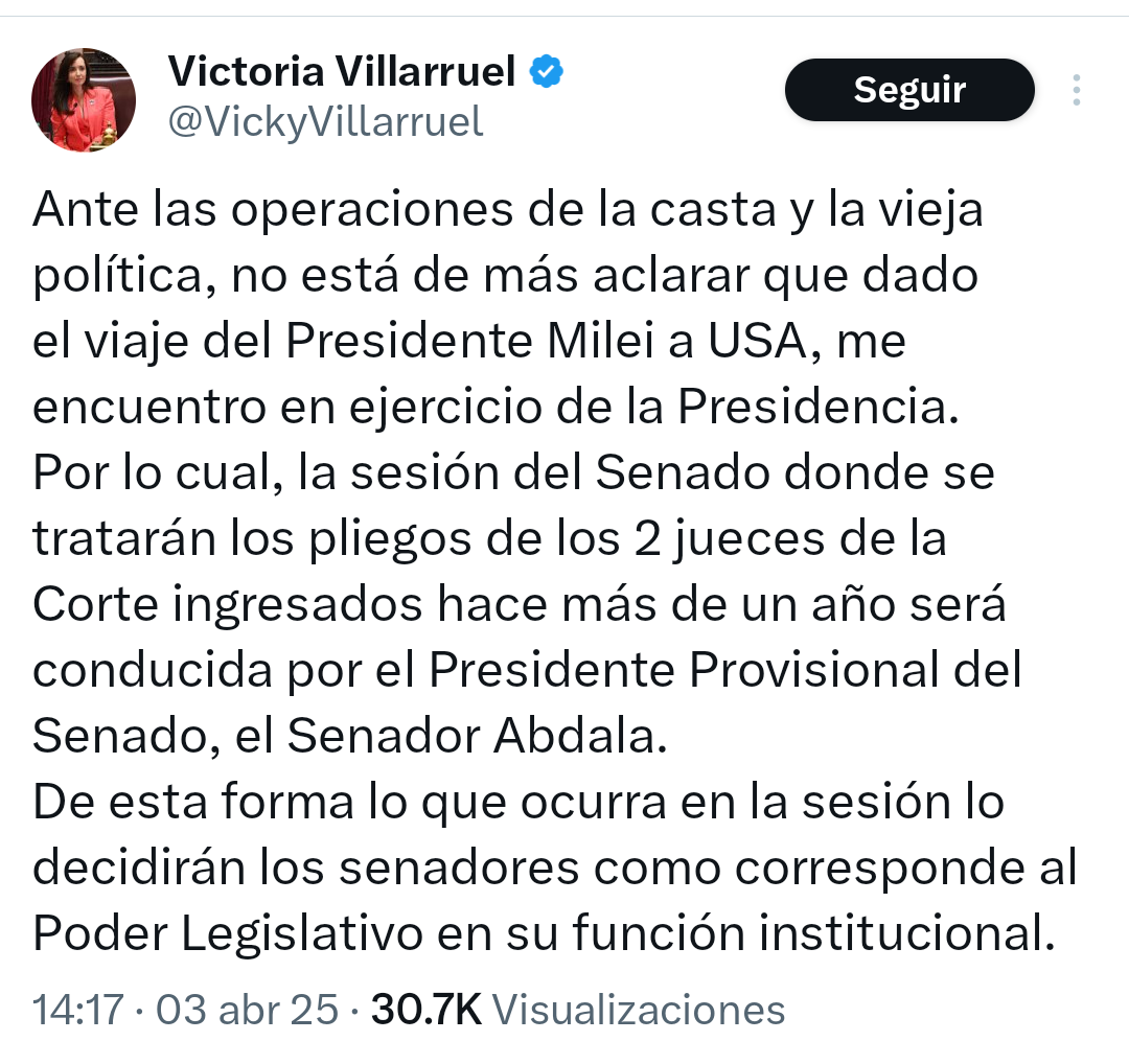 La vicepresidenta hizo un posteo en su cuenta de X, donde fustigó las críticas que recibió por su ausencia en el recinto: «Ante las operaciones de la casta y la vieja política, no está de más aclarar que dado el viaje del Presidente Milei a USA, me encuentro en ejercicio de la Presidencia“, dijo.