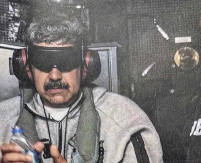 En la fotografía, Maduro aparece a bordo de un avión militar estadounidense, esposado, bajo estricta custodia y con los ojos vendados. La escena refleja el carácter reservado y de máxima seguridad con el que se desarrolló el traslado tras su detención.