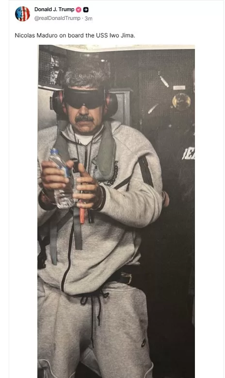 Donald Trump eligió un canal propio para hacer pública la imagen, reforzando su protagonismo en el relato del operativo. La publicación se sumó a una serie de mensajes en los que el exmandatario norteamericano ha detallado aspectos de la detención y del traslado de Maduro hacia territorio estadounidense.