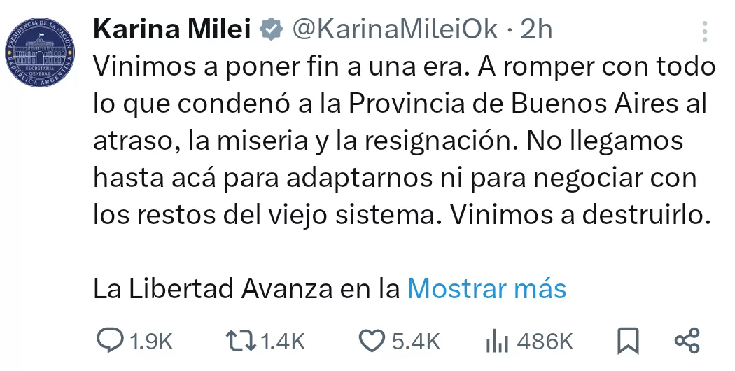 “El verdadero enemigo está enfrente. El kirchnerismo, que convirtió la provincia en su feudo. Vinimos a enfrentarlos no con discursos vacíos, sino con fuego de convicción. Hoy más que nunca, La Libertad Avanza. Y nada, ni nadie, la va a detener.”