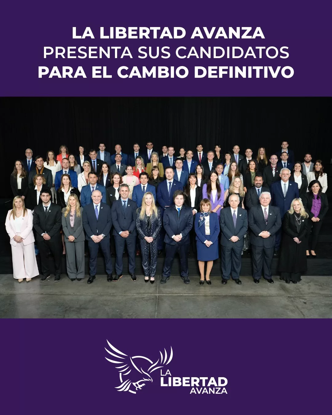 El presidente Javier Milei presentó oficialmente la lista de 32 candidatos a diputados y senadores de La Libertad Avanza (LLA) que competirán en las elecciones legislativas del próximo 26 de octubre. La foto conjunta, difundida en redes sociales, fue acompañada por el mensaje: “Los candidatos para terminar de cambiar la historia argentina”.