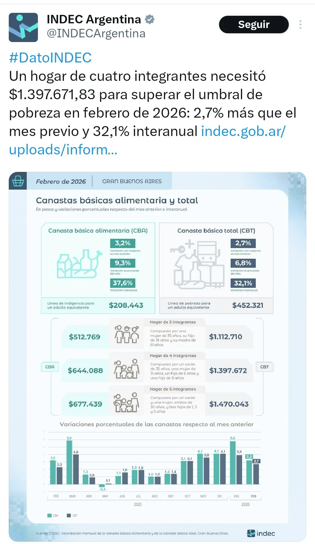 El Instituto Nacional de Estadística y Censos, INDEC, informó que la inflación correspondiente a febrero de 2026 fue del 2,9%, un registro que repite el mismo nivel observado durante enero.