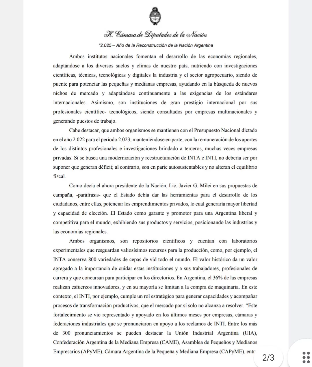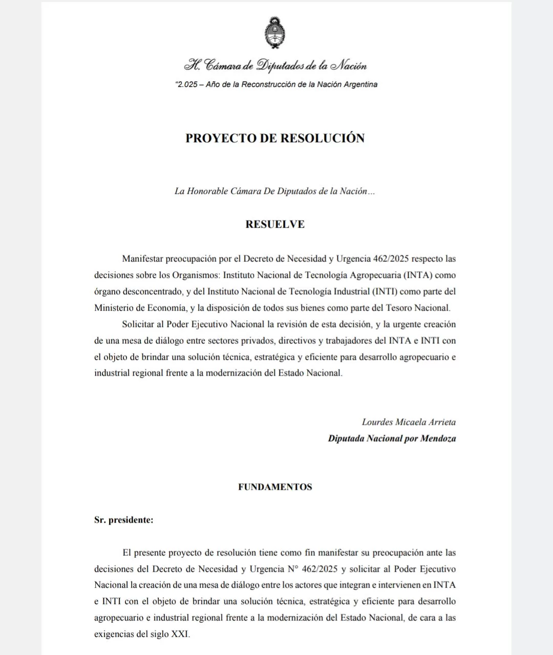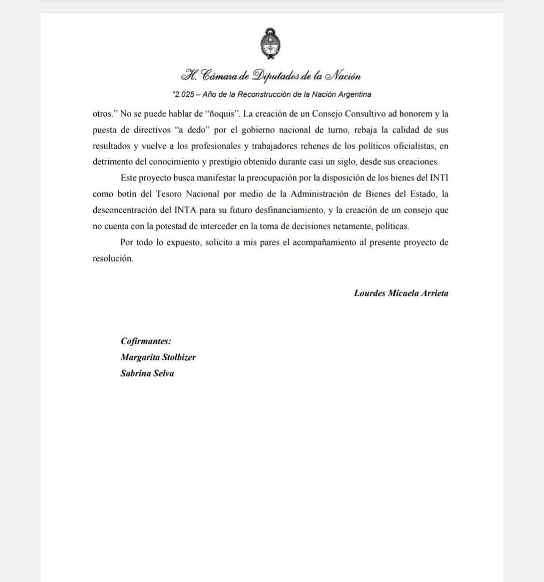 El primero de los proyectos busca rever el decreto 462/2025 mediante la conformación de una mesa de enlace integrada por autoridades y trabajadores del INTA y el INTI, junto a funcionarios nacionales, grandes empresarios y pymes. El objetivo es garantizar el diálogo institucional y evitar un vaciamiento de los organismos que cumplen funciones estratégicas en el desarrollo industrial y agropecuario.