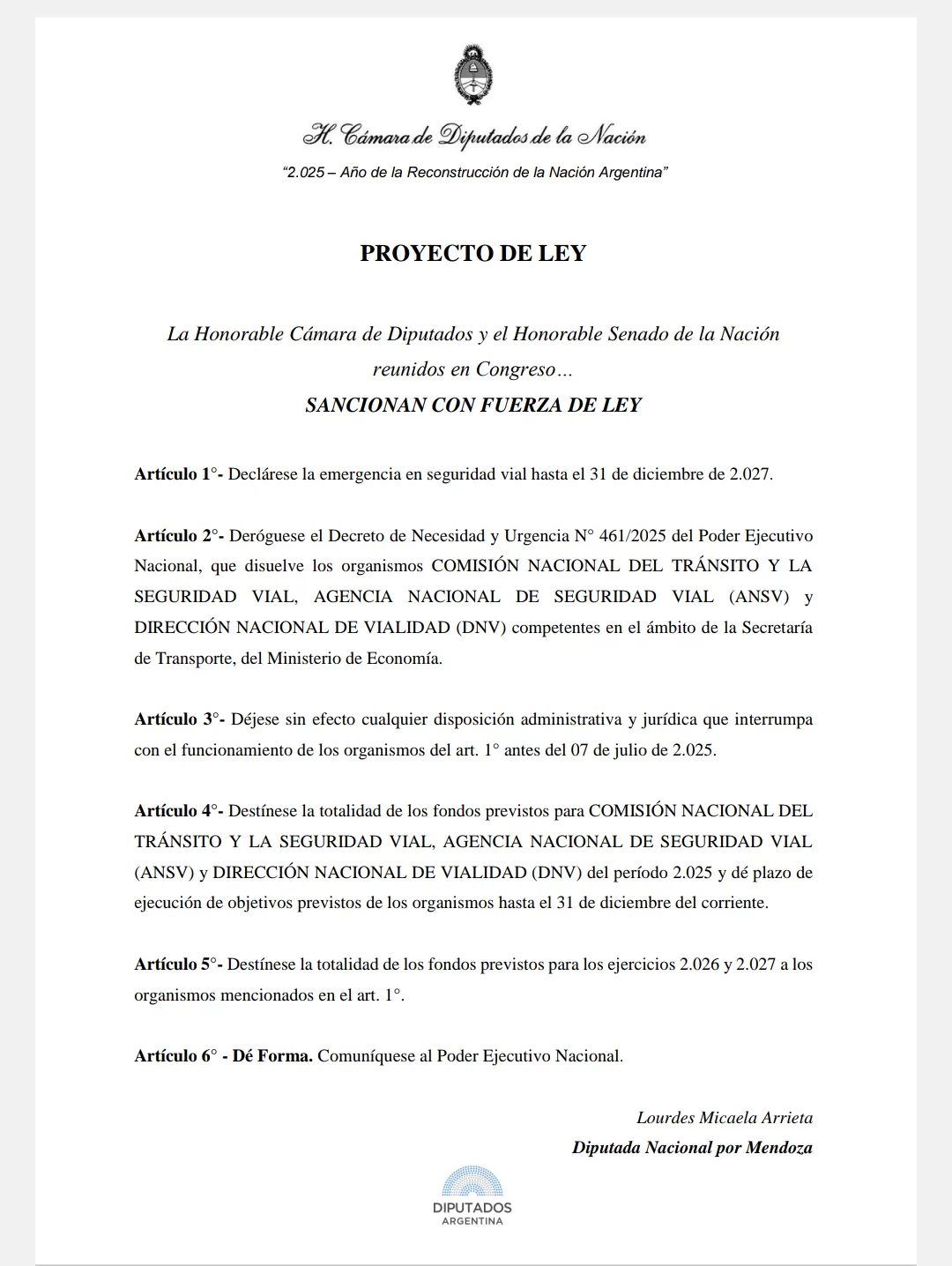 El segundo proyecto apunta a declarar la emergencia en materia de seguridad vial y a derogar el decreto 461/2025, que disuelve Vialidad Nacional y otros entes relacionados con la infraestructura vial y la prevención de accidentes en rutas.