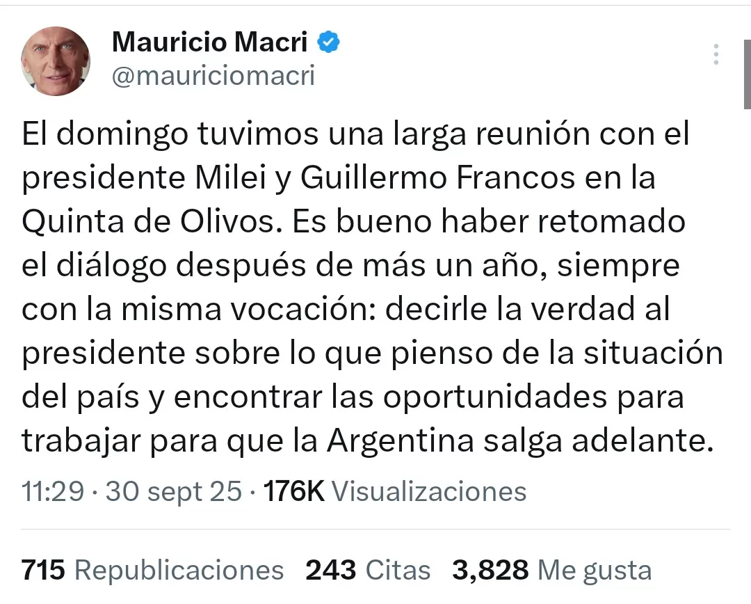 El expresidente Mauricio Macri informó a través de su cuenta de X que el pasado domingo mantuvo una larga reunión con el presidente Javier Milei y el jefe de Gabinete, Guillermo Francos, en la Quinta de Olivos.