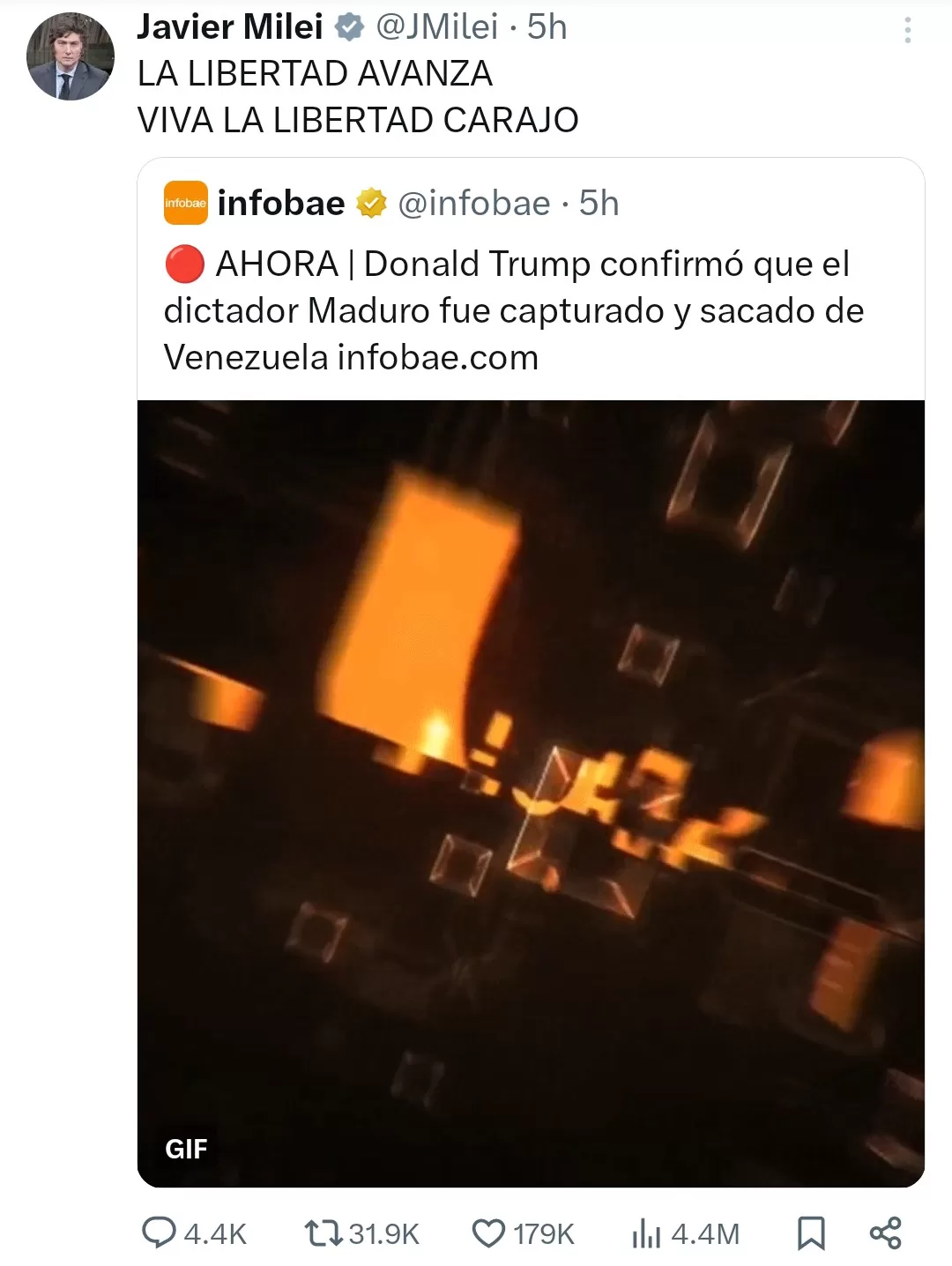 El presidente Javier Milei utilizó sus redes sociales para pronunciarse luego de conocerse la captura de Nicolás Maduro en Venezuela, en el marco de un operativo internacional atribuido a Estados Unidos. Con un mensaje breve y enfático, el mandatario escribió: “LA LIBERTAD AVANZA. VIVA LA LIBERTAD, CARAJO”, reafirmando su línea discursiva habitual.