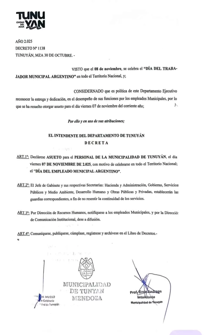 La Municipalidad de Tunuyán emitió el Decreto N° 1138, firmado por el intendente Emir Andraos, en el que se establece el asueto administrativo para el viernes 7 de noviembre de 2025 con motivo del “Día del Empleado Municipal Argentino”, que se celebra el 8 de noviembre en todo el país.