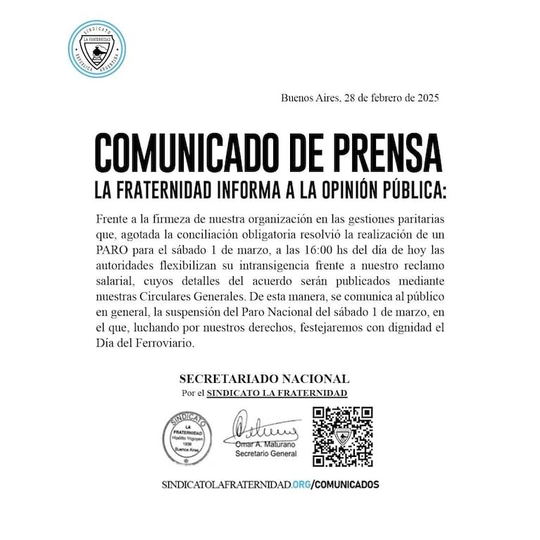El gremio La Fraternidad anunció la cancelación del paro de trenes previsto para este sábado en el Área Metropolitana de Buenos Aires (AMBA), después de llegar a un acuerdo con Trenes Argentinos sobre aumentos salariales.